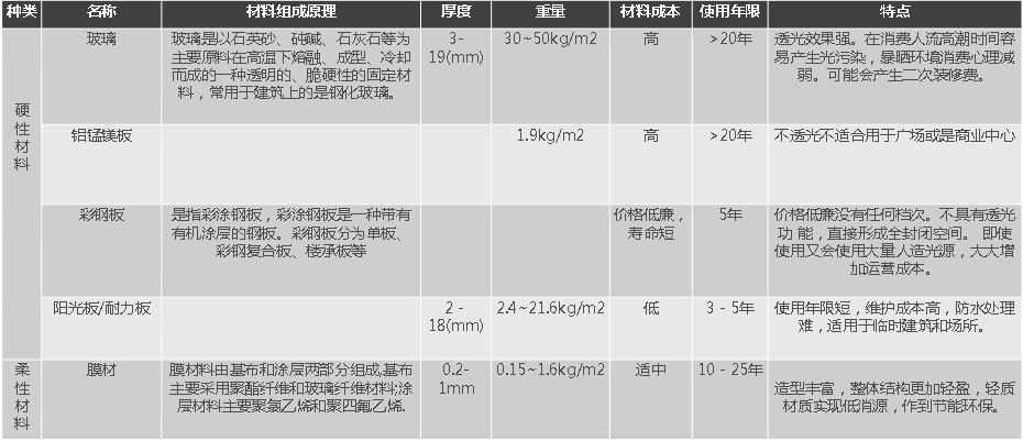 Belong to the rigid construction materials, pervious to light. Glass material variety, and widely used, mainly used for glass curtain wall construction. Due to the processing, transportation, installation, size and weight constraints, not suitable for large span roofs. Also due to the high pervious to light and high reflective glass, surrounding buildings are easily affected by light pollution, indoor also often need a second to decorate, in order to keep out sunshine point-blank.