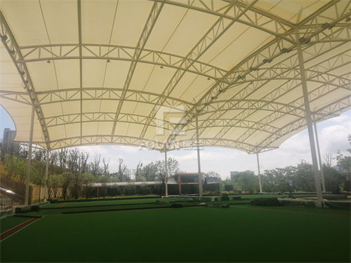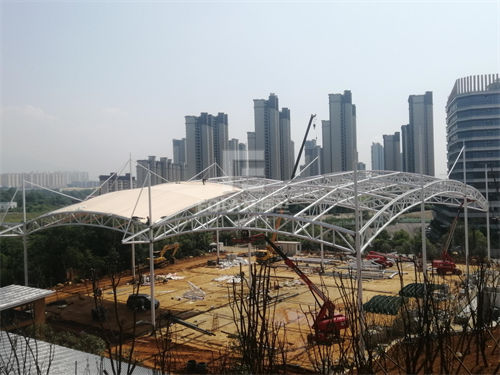 在與甲方洽談后,設(shè)計(jì)師決定采用骨架式膜結(jié)構(gòu)方案,是以鋼結(jié)構(gòu)為承重骨架、并在骨架上敷設(shè)膜材的結(jié)構(gòu)形式。膜選用的是材料優(yōu)質(zhì)、厚度適中、自潔性強(qiáng)、經(jīng)久耐用的白色膜,鋼結(jié)構(gòu)選用的是抗拉強(qiáng)度和屈服點(diǎn)高、耐腐蝕性高、沖擊韌性好、塑性好、耐久性好的鋼材。深圳市佛蘭空間膜結(jié)構(gòu)有限公司項(xiàng)目施工人員將膜材料敷設(shè)于鋼結(jié)構(gòu)上形成了一個(gè)大跨度、高度適中、寬敞明亮的風(fēng)雨門球場(chǎng)。安裝完工的膜結(jié)構(gòu)整體顏色與公園周邊景色十分協(xié)調(diào),它獨(dú)特的白色造型,為園區(qū)新添了一道靚麗風(fēng)景線,堪稱“省內(nèi)一流的膜結(jié)構(gòu)4連片風(fēng)雨門球場(chǎng)”。