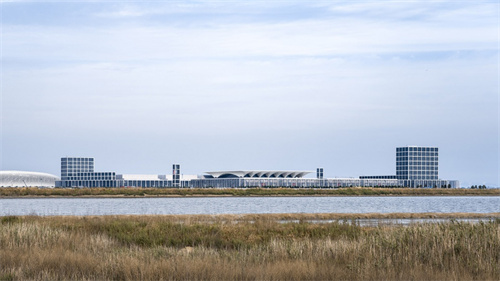 紅島國際會議展覽中心擁有14座展廳,建筑群亮點之一為入口大廳40米高的天然采光玻璃屋面,采用跨度高達93米的張拉膜結(jié)構(gòu),營造舒展起伏的獨特韻律。