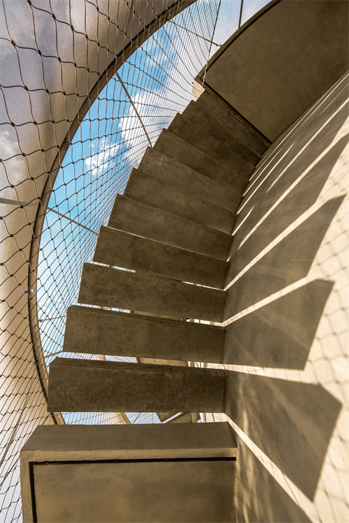 這座高23米造型獨(dú)特的餐廳足以吸引全島的目光。建筑使用鋼筋混凝土作為主要材料,金屬網(wǎng)和膜結(jié)構(gòu)作為建筑立面,垂直的桶狀構(gòu)造既是它的支撐結(jié)構(gòu)也是建筑的主體,外圍使用預(yù)制樓板制成的主樓梯盤(pán)旋而上。