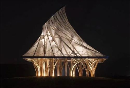 ▲膜結(jié)構(gòu)酒店門頭,佛蘭空間已竣工項目,喇叭花造型,結(jié)構(gòu)輕盈,已成為當?shù)氐貥诵跃频辍?/span>
