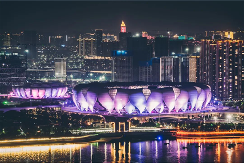 杭州奧體中心體育場(chǎng)屋頂由28片花瓣和27片小花瓣構(gòu)成,遠(yuǎn)看好似一朵綻放在錢塘江畔的“蓮花”,十分動(dòng)感飄逸。