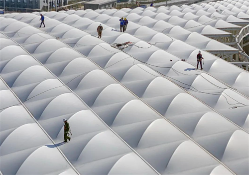 拱墅運(yùn)河體育公園體育場(chǎng)建筑結(jié)構(gòu)采用三角管桁架結(jié)構(gòu)體系,“傘架”由鋼結(jié)構(gòu)構(gòu)成,“傘面邊緣”是一條80米的大鋼管,“傘面”的屋面膜選用PTFE膜,有輕便、高透光、自潔、獨(dú)特的光學(xué)性能等優(yōu)點(diǎn)。
