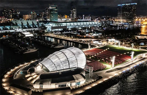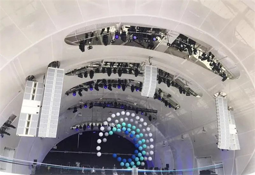 由于采用了張拉膜結(jié)構(gòu)外殼,舞臺的外觀還可以隨著正在演出的音樂隨心變換,承擔(dān)著投影屏幕的雙重角色。燈光映射在張拉膜結(jié)構(gòu)“貝殼”上,為觀眾帶了極美的視覺盛宴,也將現(xiàn)場的氛圍襯托到了極致。
