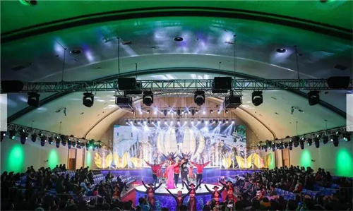 2019年“琴嶼秀”演出的室內(nèi)版水上舞臺便是在這多功能廳搭建的,國宴廳頂部大曲面的波浪造型象征海浪,有序變化的燈帶以海鷗圖形做點綴,室內(nèi)門采用白銅蝕刻泰山圖案,銅質(zhì)水紋雕刻的貝殼做門把手,體現(xiàn)海洋文化、青島特色,營造了愉悅、歡快的迎賓氛圍,室內(nèi)面積超過1000平米,具備了搭建演出平臺的良好基礎(chǔ)。