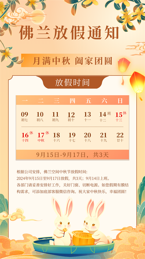 為了讓大家充分享受與家人團(tuán)聚的時(shí)光,佛蘭空間將于2024年9月15日開(kāi)始放假,假期共計(jì)3天,2024年9月18日重返工作崗位。如假期您有膜結(jié)構(gòu)需求,可添加底部客服微信咨詢(xún)哦!