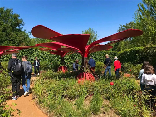 在去年舉辦的第30屆盧瓦爾河畔肖蒙國際花園節(jié)中,展示了很多新品花卉及創(chuàng)新展示方案,其中這個紅色花形景觀膜最具象征意義,它能啟發(fā)人們更多參與良性生態(tài)循環(huán),并警醒人們對水資源的價值認(rèn)識。