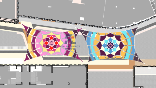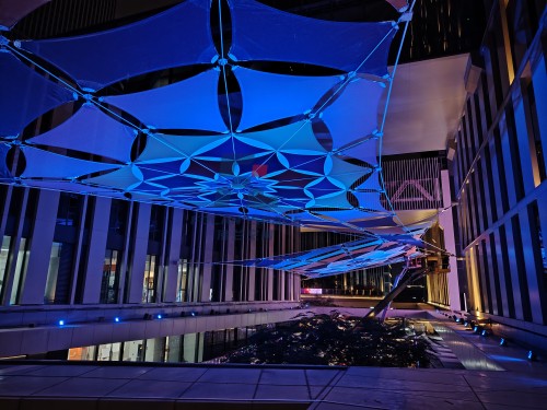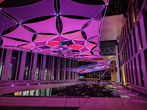 每一片“花瓣”都貼合結(jié)構(gòu)力學(xué)的精準(zhǔn)設(shè)計(jì),膜材的柔韌勾勒出花瓣的自然弧度;夜幕降臨時(shí),LED偏光染色燈通過控制系統(tǒng)實(shí)現(xiàn)色彩漸變,紫、粉、黃、藍(lán)、紅的光線穿透膜面,似繁花綴光、靈動(dòng)生長,既有建筑的嚴(yán)謹(jǐn)質(zhì)感,又有自然的柔美肌理。