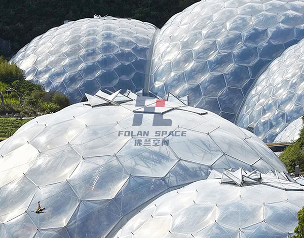 目前世界上大的植物園,為ETFE充氣膜結(jié)構(gòu)。整個(gè)建筑采用單層氣枕固定在主體鋼構(gòu)外側(cè),形狀多為六邊形。氣枕采用三層膜結(jié)構(gòu),外層厚度250μm,內(nèi)層膜厚度為200μm,中間厚度為50μm。