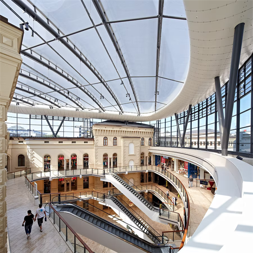 ▲零售店街道被ETFE氣枕系統(tǒng)覆蓋,營造出迷人的透明屋頂,為游客提供輕松的購物體驗(yàn)。