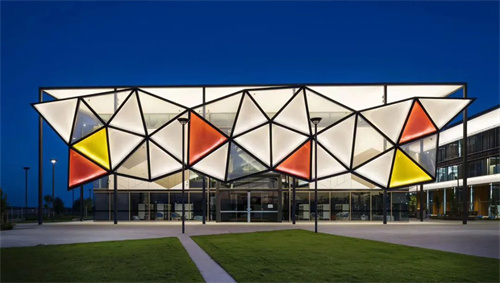 新的OranPark圖書館外立面,由31個(gè)三角形氣枕組成,氣枕設(shè)計(jì)成四種顏色:紅色,黃色,白色以及透明鍍點(diǎn),以此滿足不同部位室內(nèi)環(huán)境對(duì)陽光的需求。背面均采用透明ETFE膜,此外還增加了LED照明系統(tǒng),為夜間增加不同的視覺效果。