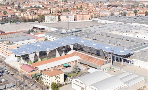 Veronafiere展覽中心決定更新展覽場地南側(cè)的“ReTeodorico”入口廣場。VectorFoiltec在17米高的鋼柱上安裝了380塊,面積達(dá)6654平方米的兩層ETFE系統(tǒng)。