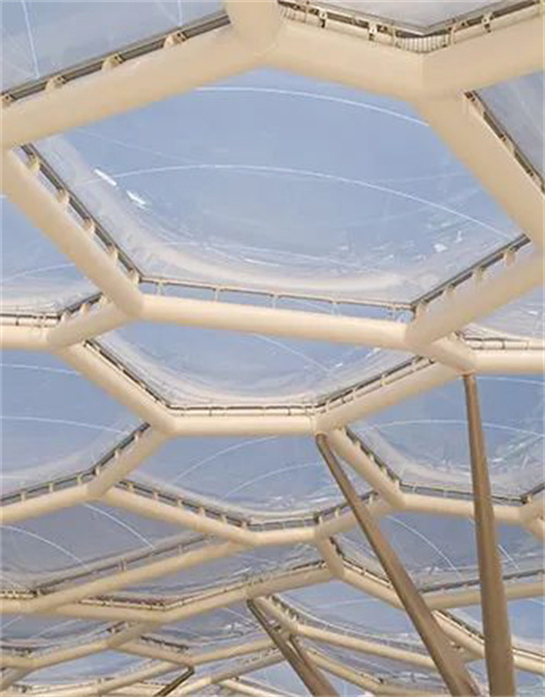 展館的功能性和多功能建筑結(jié)構(gòu)是一系列連續(xù)的拱形元素,中央空間有一個(gè)庭院,而建筑的屋頂燈就是采用的半透明ETFE氣枕膜結(jié)構(gòu)。