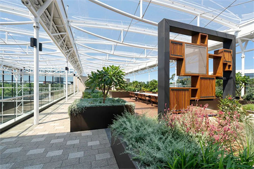 ETFE屋頂覆蓋了兩座建筑的頂層屋頂花園,并在藝術(shù)區(qū)建筑的中間形成了一個(gè)內(nèi)部中庭,將麥考瑞大學(xué)藝術(shù)區(qū)大樓連接在一起。