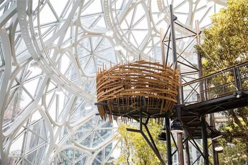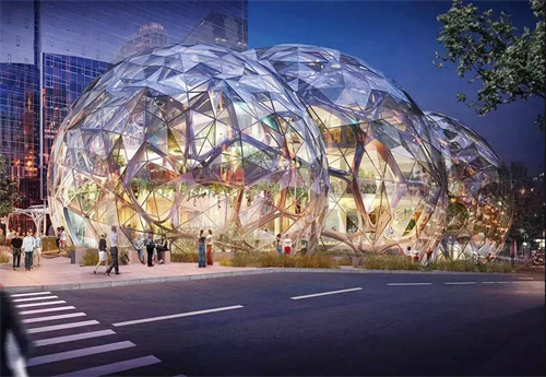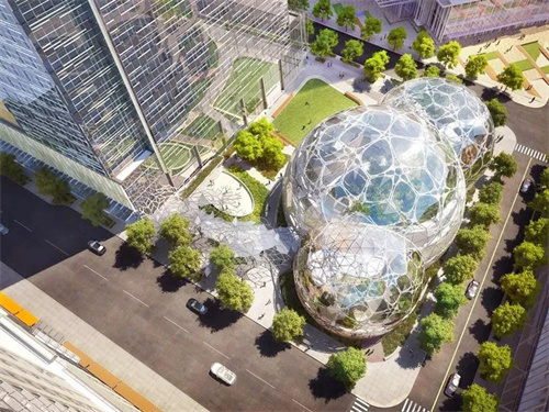 AmazonSpheres是項(xiàng)目最核心的“熱帶雨林"部分,由3個(gè)大的球狀體組成,其中最大的球狀體直徑39米,高27米,共四層。據(jù)說,整個(gè)建筑使用了2643片透明玻璃和620噸鋼。