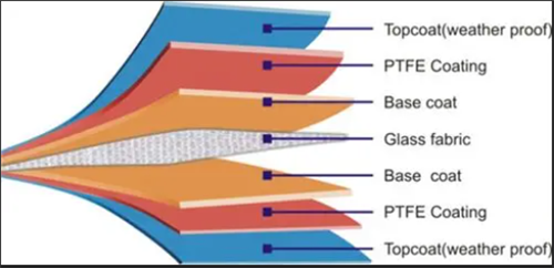 PTFE,G類膜材,采用浸漬涂層法,是在超細(xì)玻璃纖維基布上涂覆PTFE樹脂而成的復(fù)合材料。