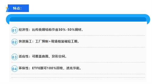 應用場景:廣泛用于體育場館、室內(nèi)運動館、體育看臺、交通設施、商業(yè)中心、展覽中心與會議廳、大跨度廠房與倉庫、物流中心、景觀膜、停車棚、環(huán)保污水池加蓋、溫室與生態(tài)大棚等建筑。