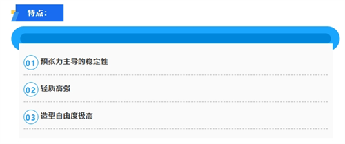定義:張拉膜結構以膜材、鋼索及支柱構成,利用鋼索與支柱在膜材中導入張力以達安定的形式。除了可實踐具創(chuàng)意,創(chuàng)新且美觀的造型外,也是最能展現(xiàn)膜結構精神的構造形式。