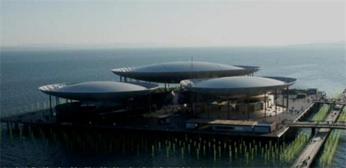 2002年瑞士博覽會(huì)在蘇黎世Neuchatel建造的名為藝術(shù)海灘(Arteplage)展館,三個(gè)一致的氣囊膜,直徑約為100.0m圓形碟狀,上翹外襯邊為骨架式膜,36根柱支承,是迄今最大的一組氣囊膜建筑。