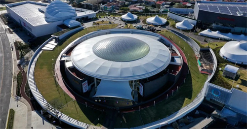 位于哥斯達(dá)黎加的Oxigeno是一個(gè)14.5萬平方米的購(gòu)物娛樂目的地,是世界上最大的屋頂公園之一。其美食廣場(chǎng)的屋面采用ETFE氣囊式膜結(jié)構(gòu)。氣囊直徑45m,投影面積1600m2,ETFE膜材厚度0.25mm。采用索網(wǎng)加強(qiáng),索網(wǎng)的網(wǎng)格尺寸1.2m。