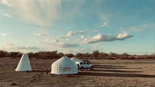 雙層PVC氣囊墻使充氣蒙古包有較好的保溫性和隔熱性,同時(shí)具備了防潮防水的特性。材料的透光特質(zhì),使得充氣蒙古包夜晚的發(fā)光方式特別,讓草原上的人更容易找到方向和目的地。