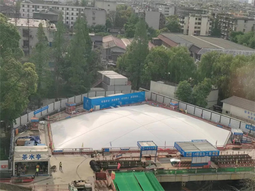四川省人民醫(yī)院綜合科研大樓建設(shè)項(xiàng)目中的氣囊式基坑氣膜是目前我國(guó)西部地區(qū)建筑工地基坑施工中首次應(yīng)用的“氣囊式”充氣膜,氣膜覆蓋面積約1200平方米,最大跨度達(dá)44米,高度6米,是一種兼具防塵性、降噪性、便捷性、智能性和安全性的新型基坑氣膜。該氣膜采用強(qiáng)度大、耐久、耐高溫紫外線的PVDF新型建筑材料,通過雙層膜+保溫棉的方式結(jié)合,具有非常顯著的隔音和保溫隔熱效果。