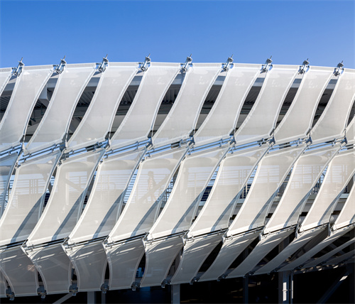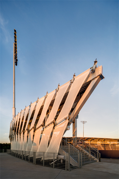 PTFE材料的半透明特性,創(chuàng)造出獨(dú)特的視覺對(duì)話。場外的人可以瞥見場內(nèi)活動(dòng)的模糊光影,激發(fā)了好奇心與參與感;場內(nèi)觀眾則能透過表皮看到公園的綠意,緩解了大型建筑的封閉感。