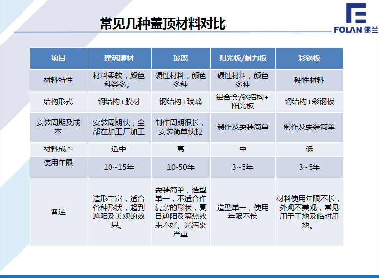 常見(jiàn)屋頂覆蓋材料,通過(guò)下表進(jìn)行對(duì)比??梢?jiàn),膜結(jié)構(gòu)的性價(jià)比好。