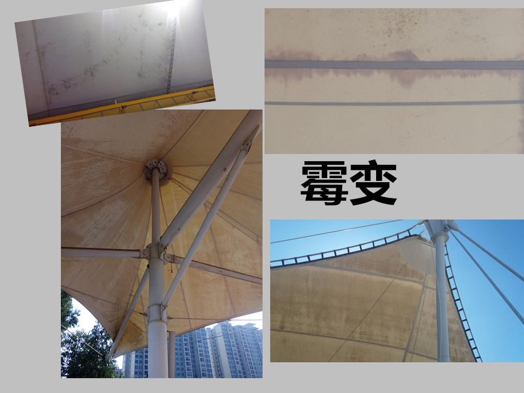 一些劣質(zhì)的膜材,往往通過(guò)少涂或者不涂自潔涂層,或涂刷其他材料(如清漆)等來(lái)降低生產(chǎn)成本,以達(dá)到低價(jià)競(jìng)爭(zhēng)的目的。而客戶又很難通過(guò)肉眼去分辨膜材表面涂層是否被造假。一般,完工后1年左右,使用劣質(zhì)膜材的工程會(huì)出現(xiàn)膜體松動(dòng)、徐變,膜材出現(xiàn)霉斑、黑點(diǎn)、更有甚者會(huì)出現(xiàn)表涂層剝離脫落。3年后,霉斑連成片,膜基布里的絲霉斷,強(qiáng)度減弱,遇大風(fēng)一吹,形成破洞、裂縫,最終破損報(bào)廢。