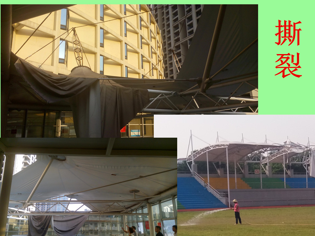 目前許多數(shù)膜結(jié)構(gòu)工程基本都是這樣的問(wèn)題。即采用了劣質(zhì)材料引起的外觀破損骯臟。