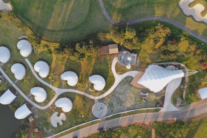 該度假酒店俯瞰過(guò)去形如露出地面的巨大卵石,較大的公共露天空間與較小的私密空間在相交的拱頂下獲得連接。入口迎賓處,酒吧,餐廳和圖書(shū)閱覽室彼此相連,如同場(chǎng)地中的天然景觀,一簇簇繭狀的張力膜結(jié)構(gòu)如同豹爪一般印刻在場(chǎng)地中,而位于其下的水池,則吸引了無(wú)數(shù)野生動(dòng)物前來(lái)光顧。