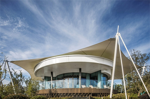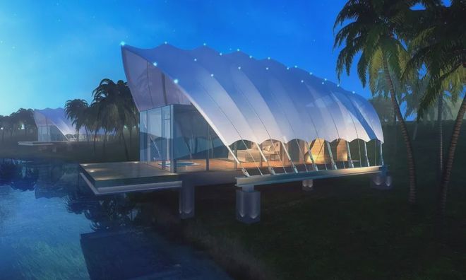 可見(jiàn)澤棲帳篷酒店,所有建筑都采用了張拉膜結(jié)構(gòu),完美地體現(xiàn)了建筑的獨(dú)特意象。