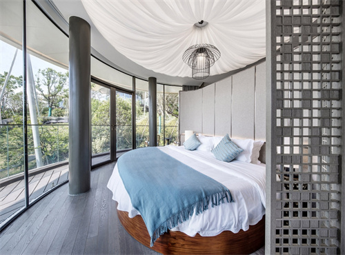 設(shè)計(jì)首創(chuàng)仿生帳篷建筑語(yǔ)匯,造型上融入多種仿生小動(dòng)物設(shè)計(jì),在如此靈動(dòng)童話般的環(huán)境空間中,客人的身體也仿佛幻化為,比蝶更輕盈,比蜂更自由的靈性存在。