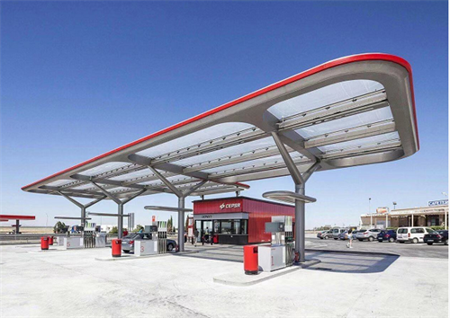 CEPSA公司是西班牙第二大石油公司,位于西班牙阿維拉的加油站設(shè)計(jì)基于品牌高技術(shù)和優(yōu)質(zhì)服務(wù)的特點(diǎn),以樹木為意向,設(shè)計(jì)加油站雨棚、泵站、照明與標(biāo)志。雨棚采用模塊化組織、可自潔的高科技ETFE材料,不僅重量輕并且可回收利用,夜晚柔光的紅色增添一絲暖意。