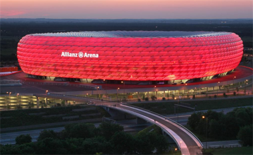 安聯(lián)球場(chǎng)外墻體由2874個(gè)氣墊構(gòu)成,其中1056個(gè)在比賽中可以發(fā)光。它外立面使用ETFE氣枕,內(nèi)嵌發(fā)光系統(tǒng),可使外墻分別發(fā)出紅光(當(dāng)球場(chǎng)作為拜仁慕尼黑隊(duì)的主場(chǎng)時(shí))、藍(lán)光(當(dāng)球場(chǎng)作為慕尼黑1860隊(duì)的主場(chǎng)時(shí))或白光(德國(guó)國(guó)家隊(duì)隊(duì)服的顏色)。