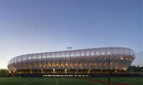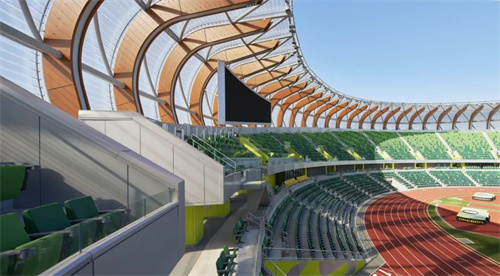 翻新后的俄勒岡大學(xué)田徑場(chǎng),是世界上最具創(chuàng)新性的田徑場(chǎng)之一。圍墻使用了鋼結(jié)構(gòu)+木結(jié)構(gòu),并在外層包覆ETFE薄膜。木頭的重要性可以追溯到1974年,它旨在展示俄勒岡州的歷史和文化,突出林產(chǎn)品。