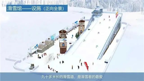 滑雪館內(nèi)的滑雪道長約90米、寬20米,出發(fā)平臺高度10米,滑雪者可乘坐魔毯上升到出發(fā)平臺?;^以經(jīng)典雪域風(fēng)光為主題,打造網(wǎng)紅打卡點。