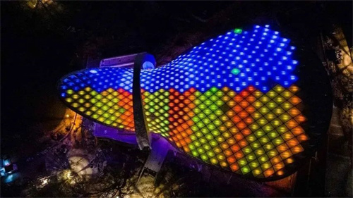 膜結(jié)構(gòu)分內(nèi)外兩層,起遮蔽作用的外層為雙向預(yù)應(yīng)力PVDF膜,內(nèi)膜為網(wǎng)格膜材。正是因?yàn)楠?dú)特的材質(zhì),其內(nèi)膜可形成超過5000平方米的沉浸式可投影天幕,這在國內(nèi)都屬罕見,也成為在此演出的最大亮點(diǎn)。