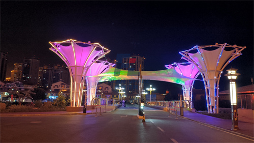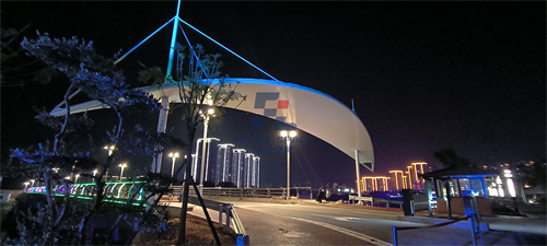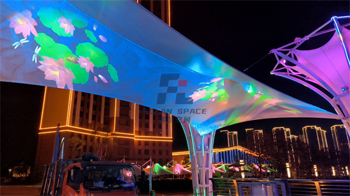 完工后的喇叭花膜結(jié)構(gòu)大門,在藍(lán)天白云的映襯下,格外引人注目。最值得一提的是其夜景,膜結(jié)構(gòu)大門自成投影天幕,獨(dú)樹一幟,各種圖案,夢幻多彩。