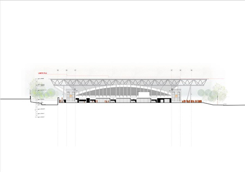 設(shè)計(jì)方案覆蓋現(xiàn)有看臺(tái),并向兩側(cè)懸挑。折疊開合式屋頂一部分由高密度建筑膜材構(gòu)成,其固定部分的結(jié)構(gòu)構(gòu)件則提供展開和移動(dòng)所需的支撐。所有構(gòu)件的設(shè)計(jì)均出于力學(xué)考慮,并不作為裝飾使用。