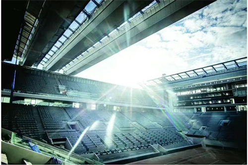 該球場(chǎng)屋頂由固定部分和可移動(dòng)膜結(jié)構(gòu)組成。固定部分裝有太陽能板及雨水回收系統(tǒng);可伸縮膜屋面由雙層建筑膜材組成:外層建筑膜材為法拉利預(yù)應(yīng)力半透光膜材TX30,使用壽命超長(zhǎng),可保證球場(chǎng)的自然采光,兼顧透光性與耐候性;內(nèi)層膜為法拉利吸音膜Silent Aw ,可有效吸收比賽時(shí)產(chǎn)生的噪音,營(yíng)造一個(gè)舒適高端的比賽環(huán)境。