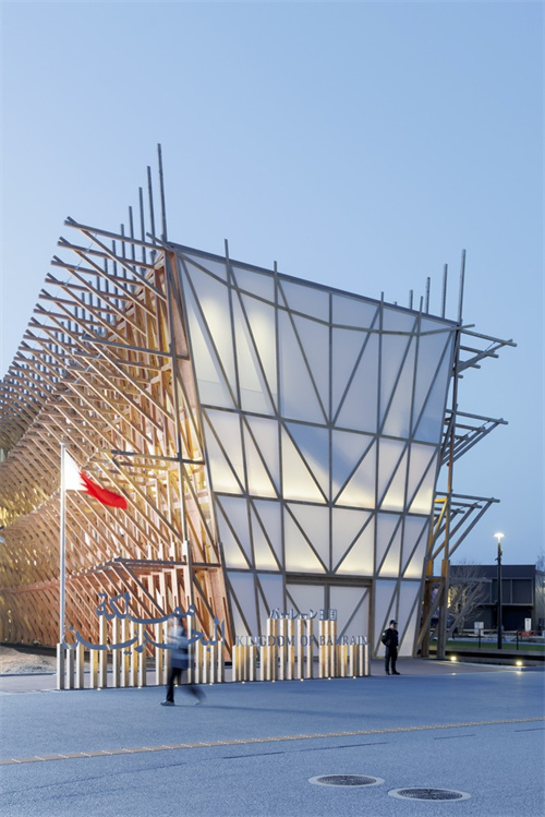 展館設(shè)計(jì)融合阿拉伯航海文化與日本木構(gòu)技藝,體現(xiàn)跨地域文化交流,如木材選用日本雪松、膜材技術(shù)結(jié)合現(xiàn)代工程。通過(guò)低環(huán)境影響設(shè)計(jì),巴林館成為循環(huán)建筑典范,回應(yīng)全球氣候挑戰(zhàn),并傳遞島國(guó)對(duì)海平面上升等環(huán)境議題的關(guān)注。